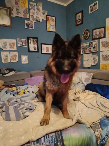 znaleziono Owczarka Niemieckiego, piesek z brązową obrożą, przyjazny