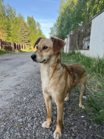 około roczna suczka, waga około 8 kg, rudawa , z krótkim ogonem