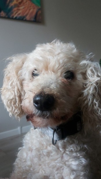 Pies ma 18 lat jest słabowidzący ma zaćmę. W dniu zaginięcia miał na sobie dwie obroże jedną szarą materiałową a drugą przeciw kleszczom. Jest średniego wzrostu, ma krótki ogon, beżową i kręconą sierść, opadające uszy, brązowe oczy.