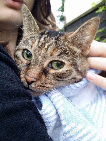 Kotka znaleziona na Kabatach przy lesie, mogła tam przebywać kilka dni. Na pewno udomowiona, bo załatwia się do kuwety, jest wysterylizowana. Nie jest typowym burasem, szylkret złoty, ma kilka lat, kamień na zębach, różowe poduszeczki