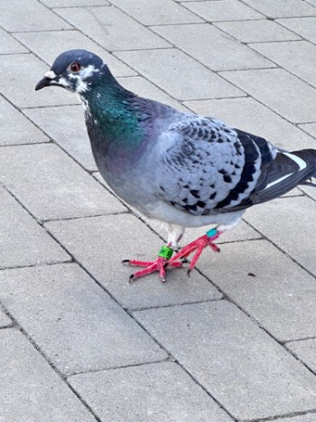 Gołąb nie może latać, jest zadbany, posiada metki na obu łapkach