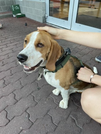 Bigiel z zielonymi szelkami znaleziony w galerii handlowej King Cross Praga