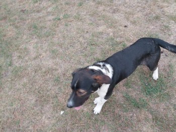 Wielkość średni. Czarny, biały brzuch i łapy. Ciemna obroża z karabińczykiem