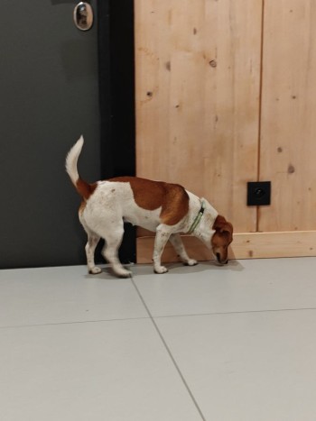 Mała ala jack Russel biały w brązowo rude łaty w średnim wieku raczej młoda, zielona obroża. Piesek przyjazny