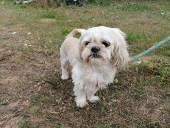 Mały, biały pies o dłuższej sierści