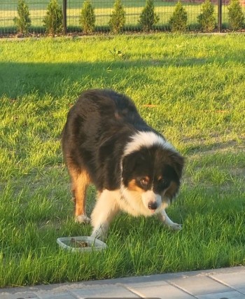 Pies typu owczarek australijski. Płochliwy, łagodny. Od maja 2025 błąka się po okolicy.
