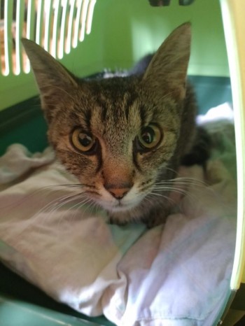 mloda, mniej wiecej 7-10 miesieczna, bura kotka, bardzo wychudzona. ufna wobec ludzi