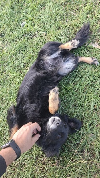 Czarna suczka na krótkich łapkach, bardzo przyjazna