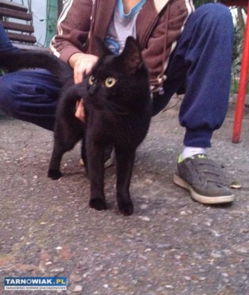 Sliczny młody wykastrowany kocurek,cały czarny,bardzo spokojny i przyjazny.Kotek ma założonego czipa ale nie jest zarejestrowany.