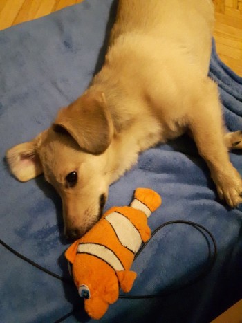Jasna suczka, łagodna, blizna na nosie. Średniej wielkości