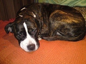 Sunia około roku, brązowa, pręgowana z białym nosem i między oczami, kwadratowe plamki wokół szyi.