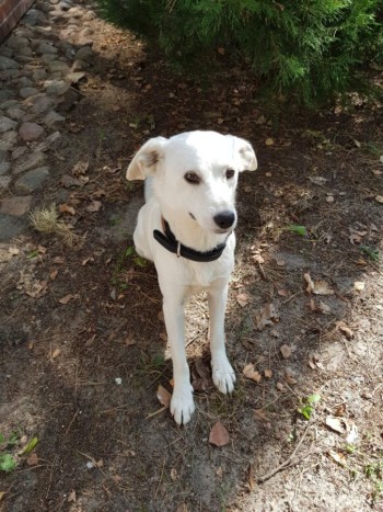 Cały biały, średni wzrost.