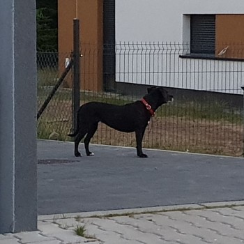 Widziany dzisiaj (2020-06-15 21:00) na budowie osiedla "Morasko Park" przy ulicy Morasko w Poznaniu (https://goo.gl/maps/7VhwtWBGH61CKUc1A). Czarny, z białymi plamkami na tylnych łapach i pod szyją. Czerwona obroża. Wygląda na nie najmłodszego.