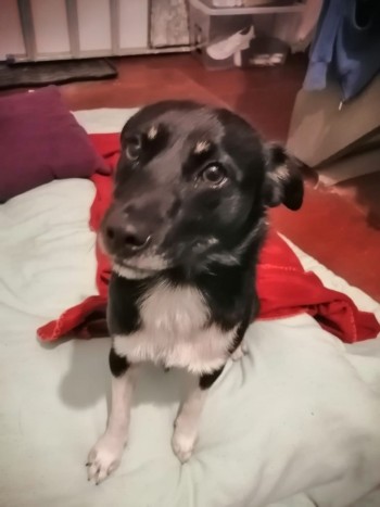 Młody, czarny kundelek z białym krawatkiem i dwoma białymi łapkami przednimi, tylne dwie łapki ciemnejsze. Bardzo radosny i usłuchany piesek. Średniej wielkości.