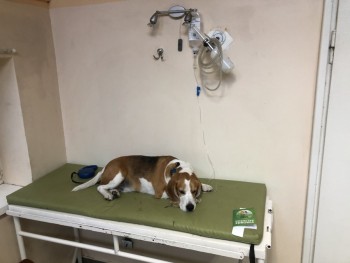 5letni beagle Scooby tricolor biało,brązowy, czarny z biała latka na tyłku nad ogonem z czerwona obraza i imiennikiem z danymi właściciela.