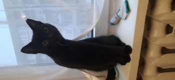 Kot udomowiony cały czarny, znak charakterystyczny nacięte lewe ucho. Przyzwyczajony do dzieci.