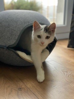 Biało szary, z szarym ogonkiem zakończony białym pędzelkiem. Koło 4-5 miesięcy, z szara obrożą. Bardzo przyjazny, gadatliwy i odważny. Zabezpieczony.