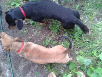 W okolicach Piaseczna przybłąkały sie dwa jamnikowate psiaki- ruda sunia i czarny młody piesek.