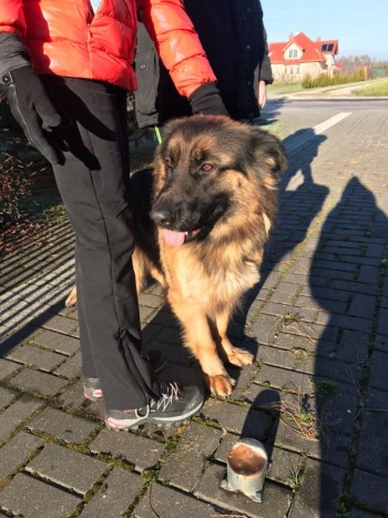 Czerwona obroża. Najprawdopodobniej młoda suka, owczarek ale chyba nie niemiecki (może długowłosy)