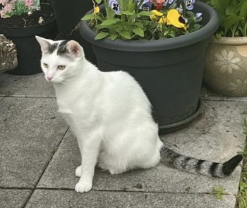 Wir vermissen unsere Katze. Weiß mit grauen Flecken am Kopf und Schwanz. Gestreift am Schwanz. Reagiert auf den Namen Luna.