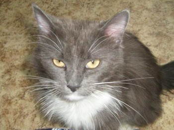 Graue Katze mit weißem Hals und Bauch. Weiße Pfoten. Ähnlich wie der Name Pumbaa