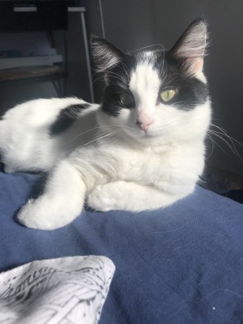 White cat with black patches, a black tail and green eyes. He?s a year old male that?s never been outside on his own before. Gentle but scared of strangers. He?s got a glittery silver collar on with a bell.