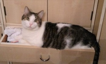 Dość duży, 6 kh kot, biało-szary z dużą białą plamką na grzbiecie.