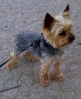 Dog Yorkshire terrier , Coat short , Colour silver - gold , some front teeth are missing
