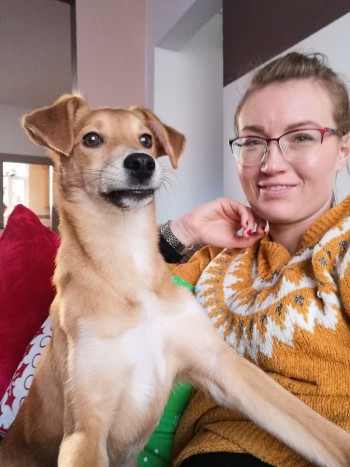 A Young crossbreed dog(mix) , small, red in color with long legs.