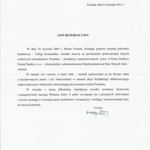 W dniu 30 stycznia 2009 r. Miasto Poznań, działając poprzez miejską jednostkę budżetową - Usługi Komunalne, zawarło umowę na powierzenie prrzetwarzania danych osobowych mieszkańców Poznania - posiadaczy zarejestrowanych psów z Firmą Geulincx Poland Spółka z o.o. - właścicielem i administratorem Międzynarodowej Bazy Danych Safe-Animal.