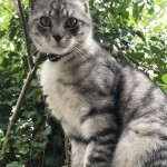 Kot szaro-srebrny, pręgowany ogon, białe skarpetki i biały śliniak, 6 lat, duży okaz. Znak szczególny: dolna warga do polowy jasna, od połowy czarna. Minimalny brak kawałka ucha, minimalny brak kawałka języka.