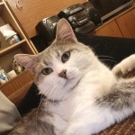 Biało-rudy dość duży kocur. Przyjazny, ufny, lubi glaskanie. Może reagować na imię Latte