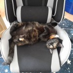 Szylkretowa kotka (czarna z rudawymi plamami) z zielono-żółtymi oczami i pomarańczową obróżką. Do obróżki przymocowany jest brelok z kodem QR. Na tylnej łapie jeden opuszek jest różowego koloru, w przeciwieństwie do reszty czarnych opuszków.