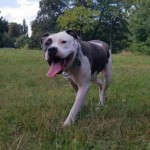 Amstaff 4 lata, suczka , maść blekitno-biala ( w łaty), kolczatka z zieloną przewieszka w kształcie dzwonka i adresem Weterynarza.