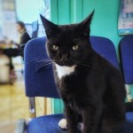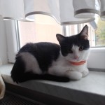 kot domowy, krótkowłosy czarno-biały, z pomarańczową obrożą. bardzo boi się obcych i hałasu