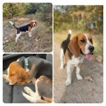 Beagle z niebieską obrożą w żółte banany i adresówką