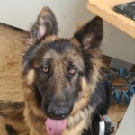 Łagodna 7 miesięczna suczka, ma na szyji , obrożę koloru czerwonego ,jest dość masywna około 35-40 kg .