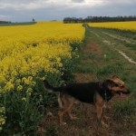 Wabi się Abi. Ma na sobie czarne szelki z odblaskiem na grzebiecie.- zaćma lewego oka.