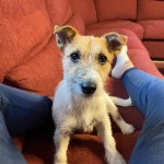 pies do kolana, rudy, długie włosy, ma brązową obrożę