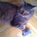 Bury kot, lat 12, dłuższa sierść i puchaty ogon, zielone oczy