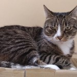Pręgowany burasek, białe skarpetki i krawat. Cecha charakterystyczna: równo pół nosa jest białe.