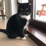 Kot czarno- biały. Nieufny w stosunku do obcych.