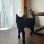 Kot jest czarny , ma białą plamkę na klacie i ma niektóre paluszki białe.