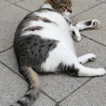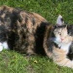 9 letnia kotka biało- bura nie duża, nie ufna do ludzi, charakterystyczny zwisający brzuch po sterylizacji