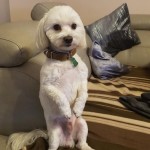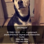 Ogłoszenie grzecznościowe. Piesek ma 6 lat, staje na tylnych łapkach. Wabi się Laki
