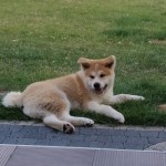 Szczeniak koloru rudo białego z zakręconym białym ogonem.