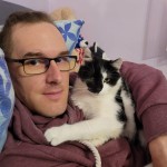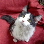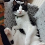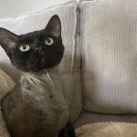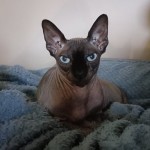 kot rasy devon rex, sierść czarna, krótka. W połowie łysy, krótkie kręcone wąsy. bardzo przyjazny, ufny.