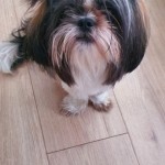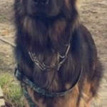 mały szczuply samiec masc czarna podpalana nie ma ogona mial czerwone szelki na sobie siega do kolan