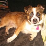 MAŁY PIESEK MAŚCI BRĄZOWO-BIAŁEJ. MA GRANATOWĄ OBROŻĘ Z ROŻOWĄ ZAWIESZKĄ INFORMUJĄCĄ O MIKROCZIPIE. ZNAKIEM SZCZEGÓLNYM JEST NIEBIESKA PLANKA NA LEWYM OKU- SKUTEK OPERACJI
