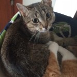 Dwuletnia kotka, trochę płochliwa, ale jak już się ją złapie to się łasi. Bura z rudawym brzuszkiem, czarnymi łapkami.
